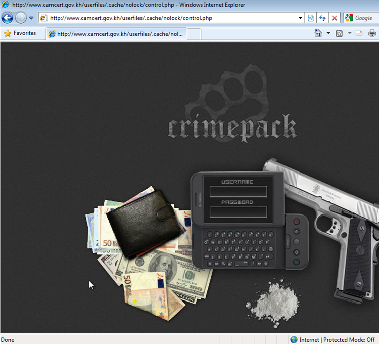 And pointing one's browser to http://www.camcert.gov.kh/userfiles/.cache/nolock/control.php and using Crimepack's default username "crimepack" and an empty password logged us into Crimepack's UI, as shown on the first screenshot of this post.